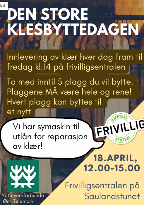 | Tir | 14.04. | 17:00 | Utstyrslager er ope | Saulandtunet 426, Biblioteket/Frivilligsentralen | Hjartdal frivilligsentral |
